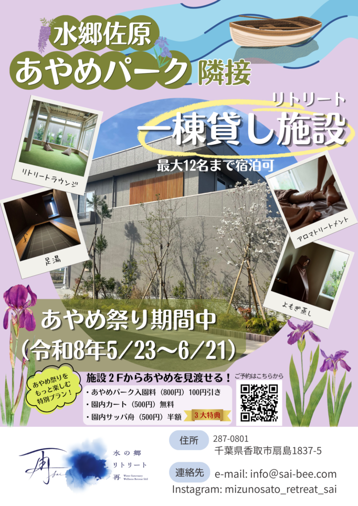 水の郷リトリート再に隣接する水郷佐原あやめパークでは5/23~6/21にあやめ祭りが開催されます。